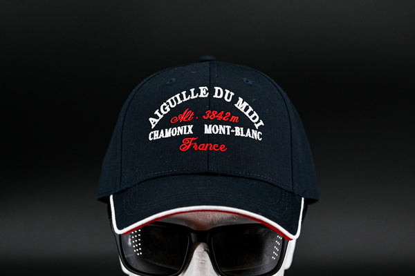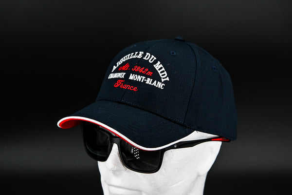 • Casquette brodée bleue marine, liseré blanc, visière rouge